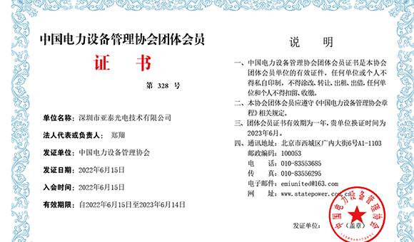 近日,深圳市亚泰光电技术有限公司正式接到中国电力设备管理协会颁发的“中国电力设备管理协会单位会员证书”,经过前期申请、材料评审等一系列工作,亚泰光电正式成为中国电力设备管理协会的一员。