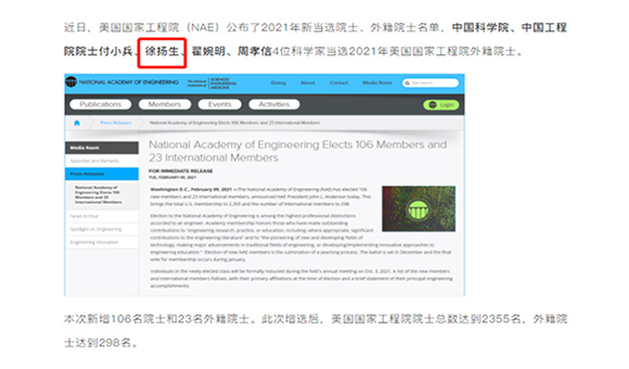 热烈祝贺徐扬生当选2021年美国国家工程院外籍院士