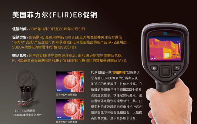 促销方案:促销期间,最终用户每订购1台E6红外热像仪并关注官方微信“菲力尔”完成“产品注册”,即可获赠1台FLIR最近推出的新产品TA72通用型3000A柔性电流钳附件(价值1899元/台)。