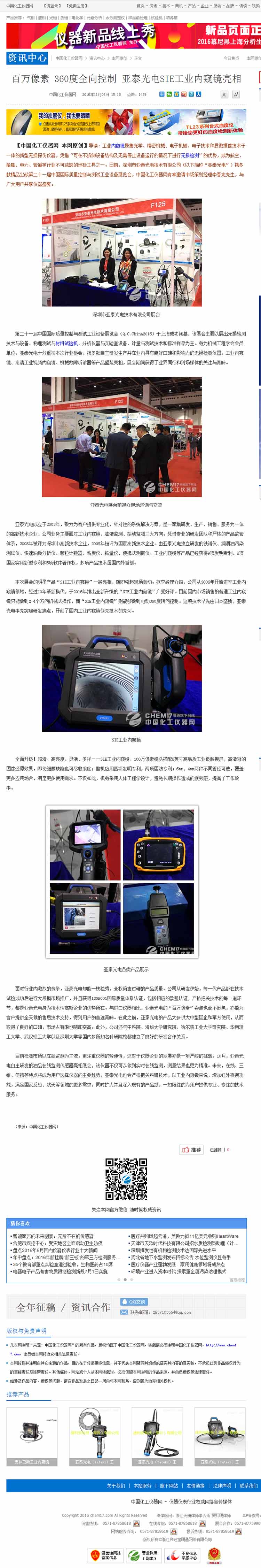 11月初,亚泰光电应邀出席2016第二十一届上海中国国际质量控制与测试工业设计展览会,该展会目前是中国工业检测领域中规模最大、历史最久、范围最广的品牌展会,亚泰光电携自主研发生产的国产SIE百万像素超清工业内窥镜惊艳亮相本次展会,参展期间,应邀接受国内最早进入仪器仪表行业的专业网站——化工仪器网《高端访谈》栏目专访,《高端访谈》栏目是中国化工仪器网全新打造的核心栏目,旨在把握行业跳动脉搏、全面报道名企动态,此次访谈节目在业内外获得了较好的传播效果。