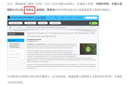 据悉:当地时间2月9日,美国国家工程院发布通知,(NAE)公布2021年新当选院士、外籍院士名单,本次 新增106名院士和 23名外籍院士。此次增选后,美国国家工程院院士总数达到 2355名,外籍院士达到 298名。其中,中国科学院、中国工程院院士徐扬生入选!