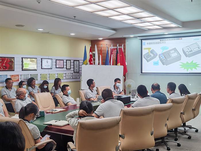 本次发布会发布的四款油液监测新品分别是:油料光谱仪、快速综合油品检测仪、多功能铁量仪及在线油液监测系统,油液监测研发工程师刘工首先为我们上台分享了油料光谱仪的相关知识,产品特点、亮点及技术特色等,现场各部门同事认真聆听、积极提问,接下来的环节是快速综合油品检测仪的齐工及多功能铁量及在线监测系统的林工陆续上台为大家分享新品的产品特色及技术亮点。