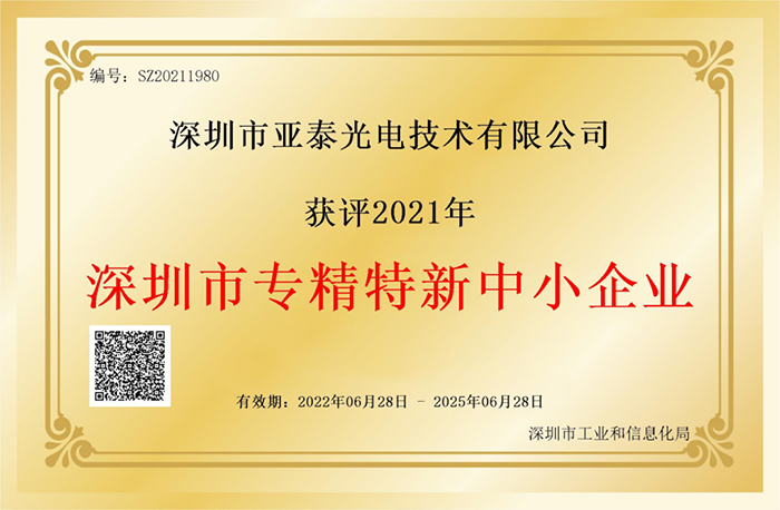 喜讯|深圳亚泰光电获得深圳市“专精特新”企业荣誉称号!