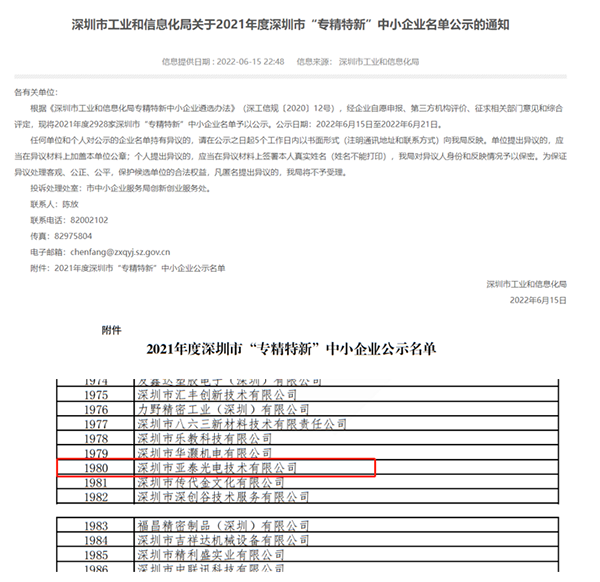 近日,深圳市工业和信息化局发布了《关于2021年度深圳市“专精特新”中小企业名单公示的通知》,深圳市亚泰光电技术有限公司名列榜中。