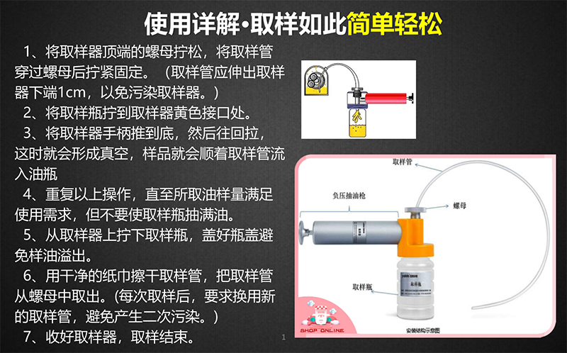 亚泰光电YBC负压油品取样器产品隆重升级为油品取样器套装,加量不加价,升级后的油品取样器套装包含:油品取样器、油液取样管、油液取样瓶、取样器密封圈、高品质外箱,油品取样器采用负压抽油枪,搭配一次性无污染油液取样管、油品取样瓶,有效避免外界杂质污染油样;取样器可用于对现场的润滑油等油液取样,带回实验室进行铁谱、光谱、粘度、铁量等指标的分析。